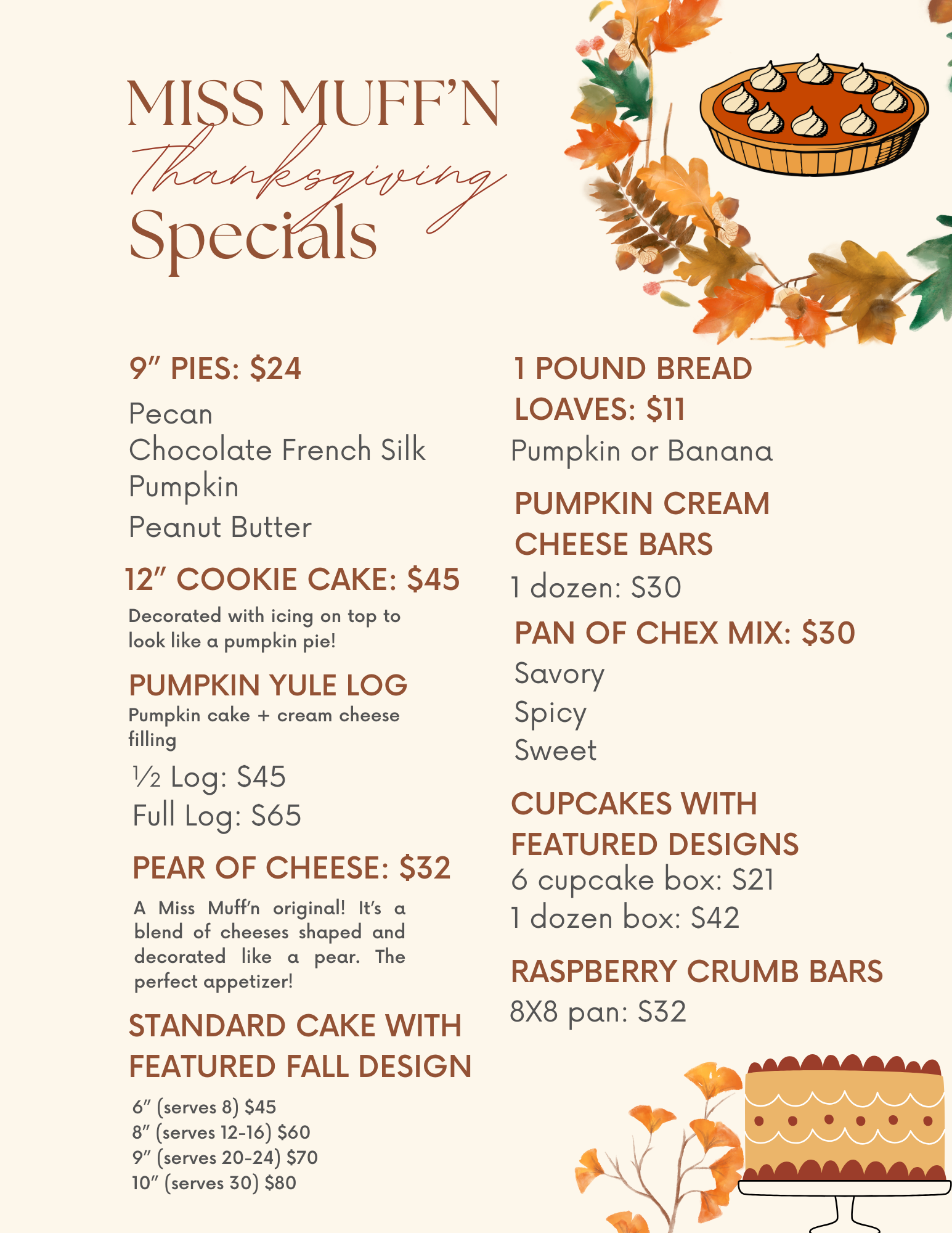 It is time to place your Thanksgiving pre-order! You are welcome to order whatever you would like off of our menu, but we have some fun holiday specials you may want! Take a look at our menu and submit a request online. You can also come in to order/place an order over the phone at 901-757-1258.